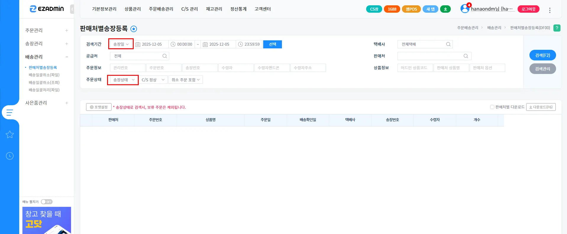 주문배송관리 - 배송관리 - 판매처별송장등록 - 검색 클릭