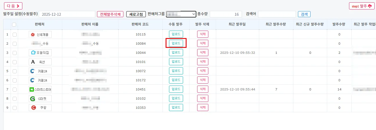 수동으로 발주할 판매처의 업로드 버튼을 클릭해주세요.