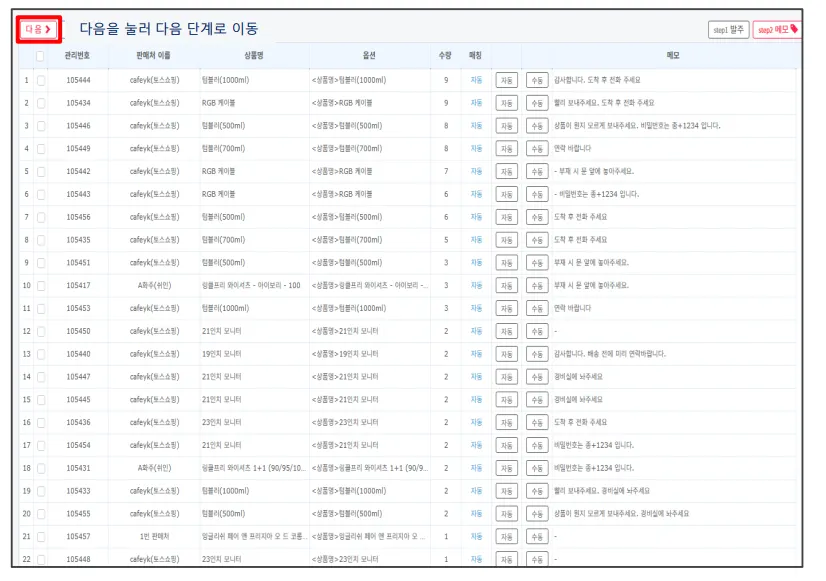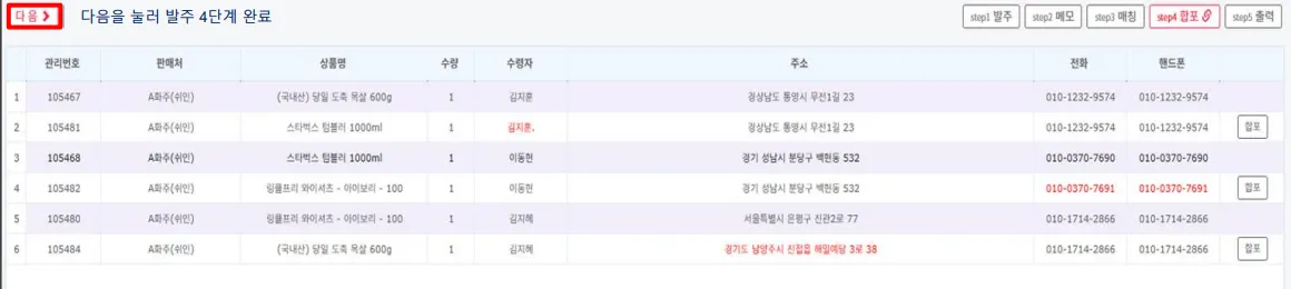 수령자명, 주소, 연락처를 조건으로 주문을 합포장하는 단계입니다.