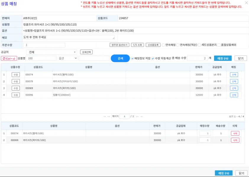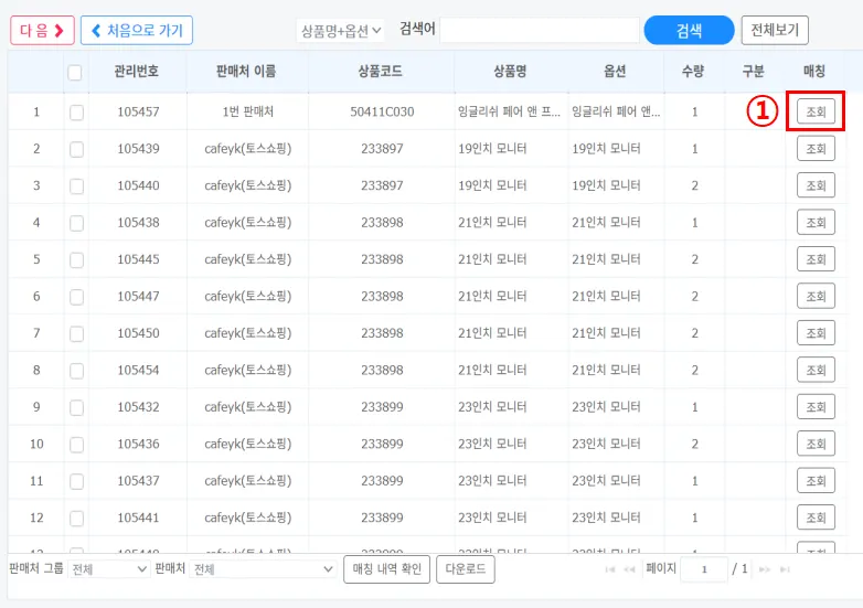 2. 상품명 검색 > 상품 선택 > 매칭 클릭