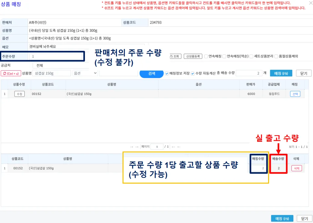 매칭수량과 배송수량 단품과 동일하게 확인해주세요